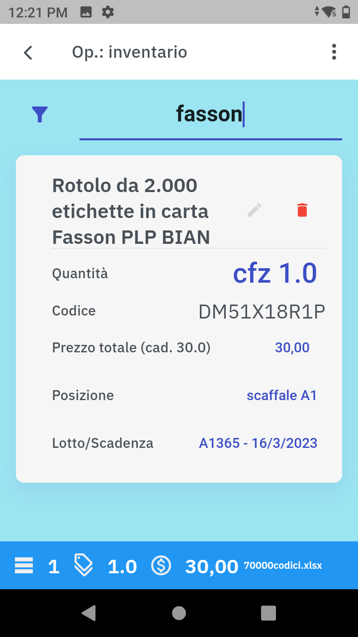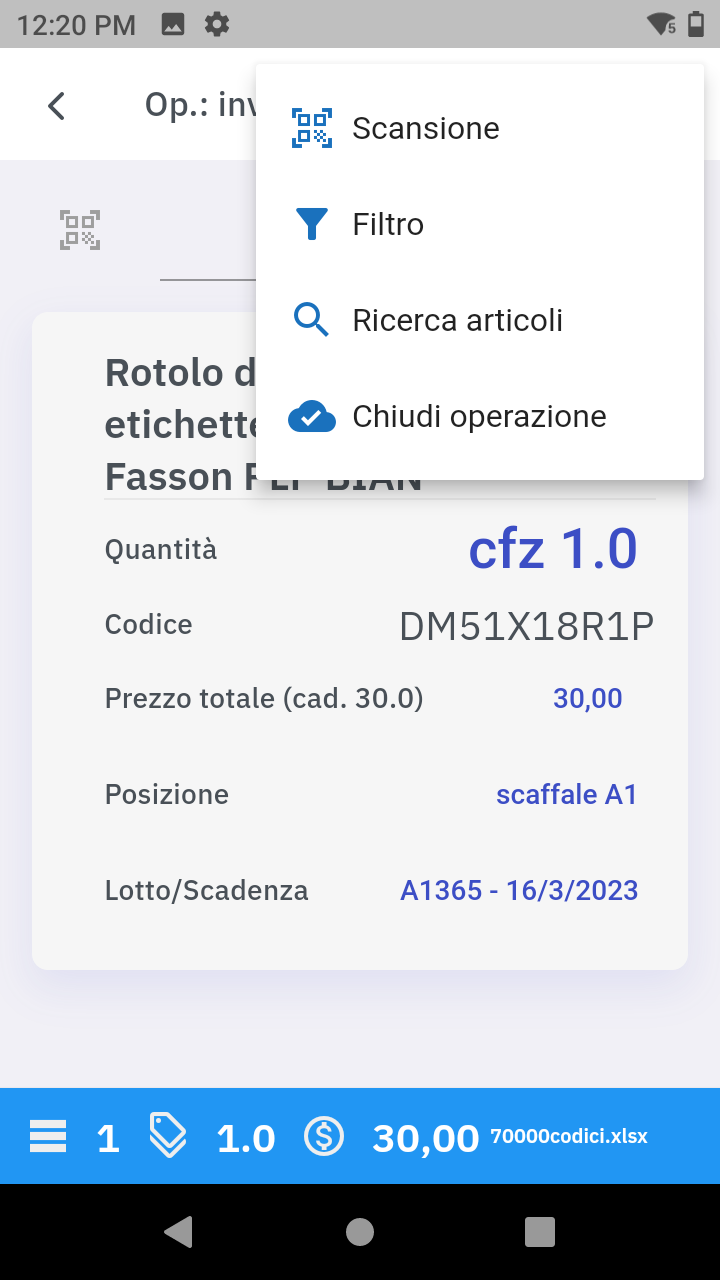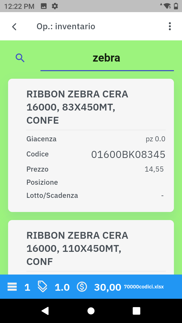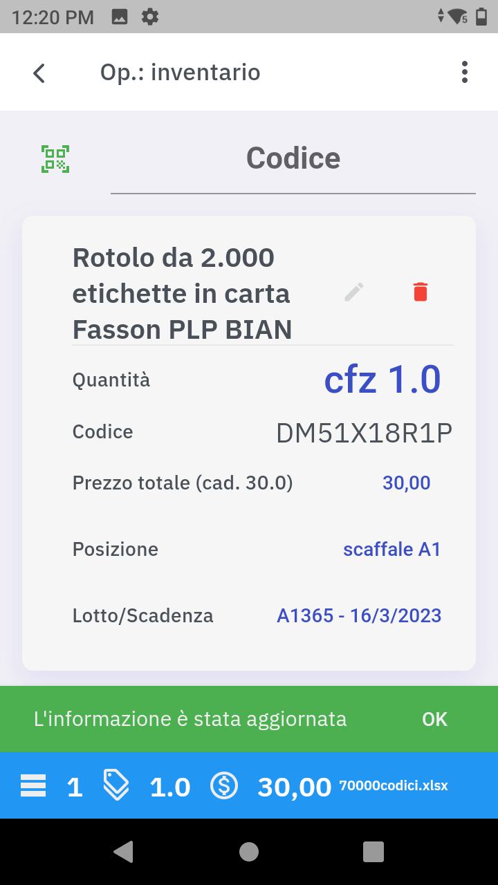 Durante la fase di lettura dei prodotti il programma rileverà automaticamente gli articoli appena scansionati presenti nel database (anagrafica prodotti) precedentemente caricato mostrando, in tempo reale, informazioni come la descrizione, il prezzo, la giacenza, la posizione di magazzino.